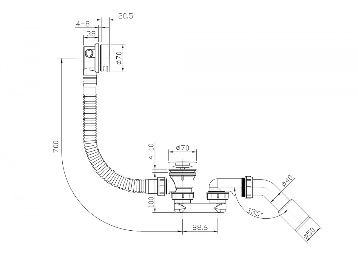 - Универсальная конструкция с гофрой длиной 70 см и регулировками подходит для установки на ванны любых типов и размеров.