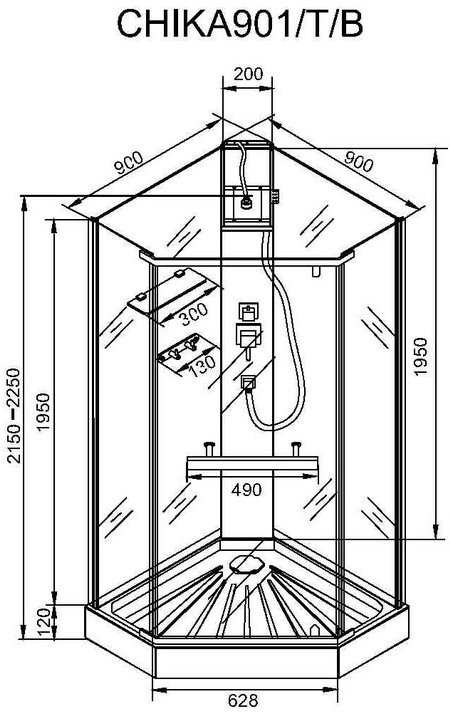 Душевая кабина CeruttiSpa CHIKA 901B 90x90 без крыши, стекла прозрачные, профиль черный, общий размер (ДхШ): 90x90, низкий поддон, форма: пятиугольная, полка в комплекте