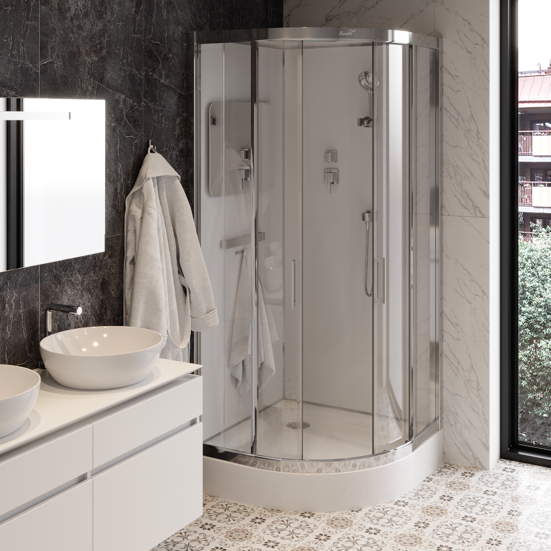 - Тип кабины - Душевая кабина для пристенного монтажа, угловая (форма поддона - четверть круга)