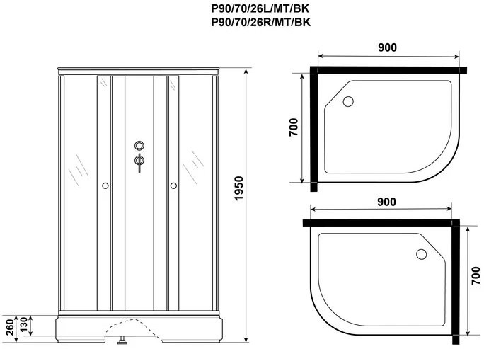 Душевая кабина Niagara Promo P90/70/26L/MT/BK 90x70x195, общий размер (ДхШ): 90x70, средний поддон, матовое стекло, белый профиль, форма: асимметричная, закругленная