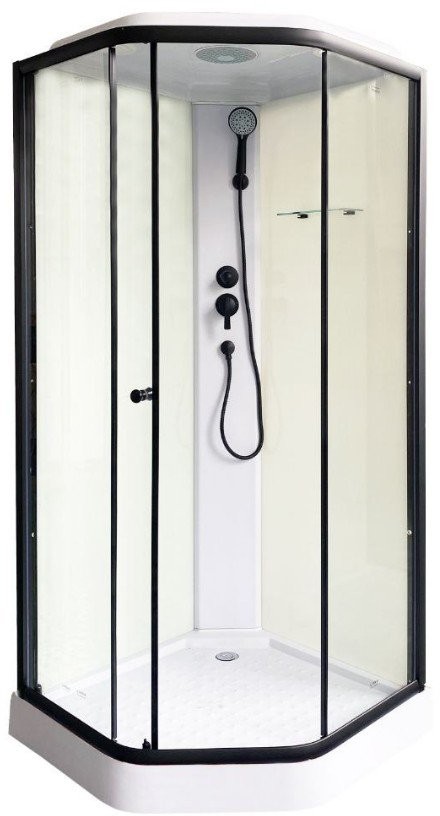 Душевая кабина Parly Penta P91B 90x90 прозрачные стекла / белые задние стенки / черный профиль, общий размер (ДхШ): 90x90, форма: пятиугольная, полка в комплекте