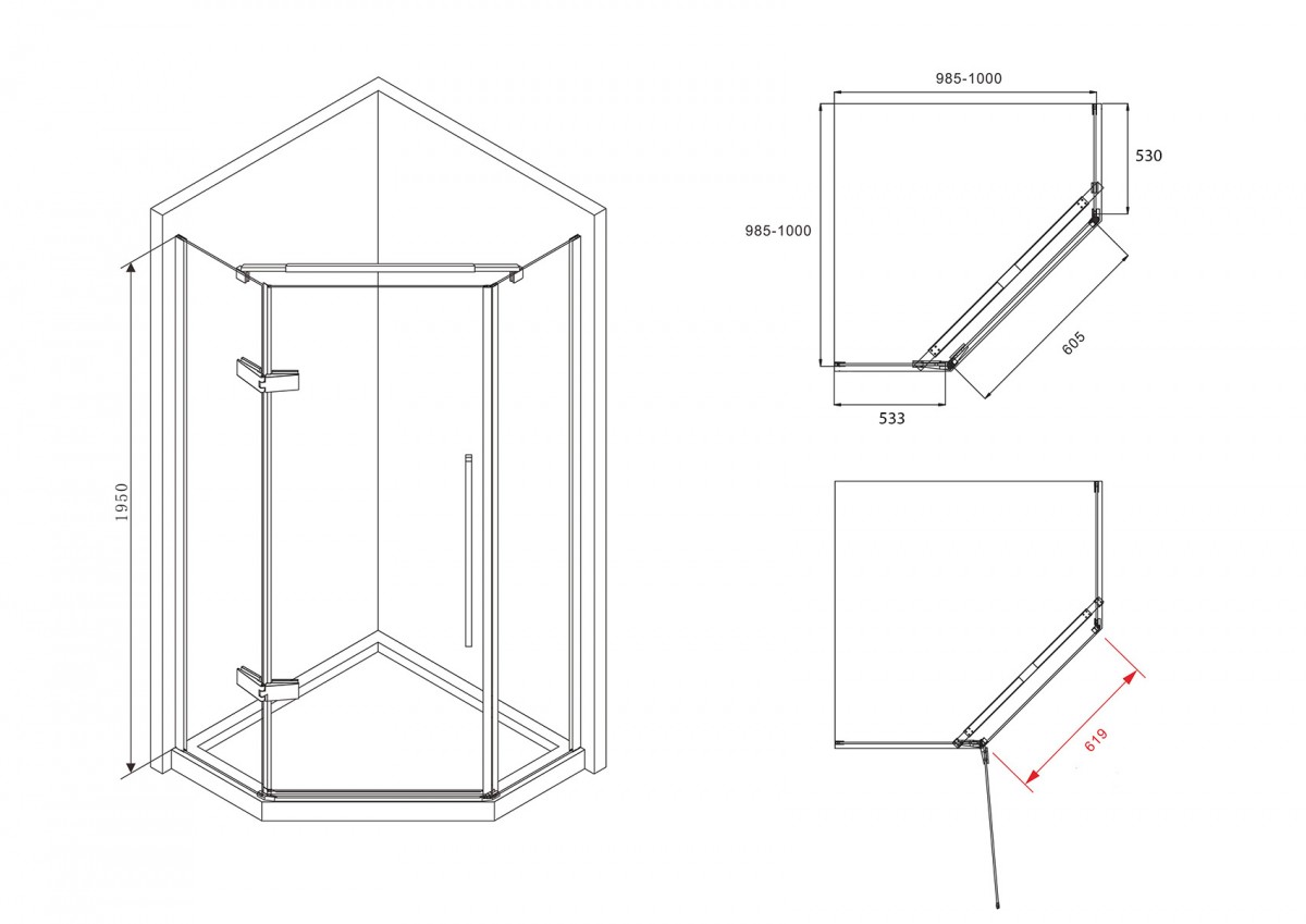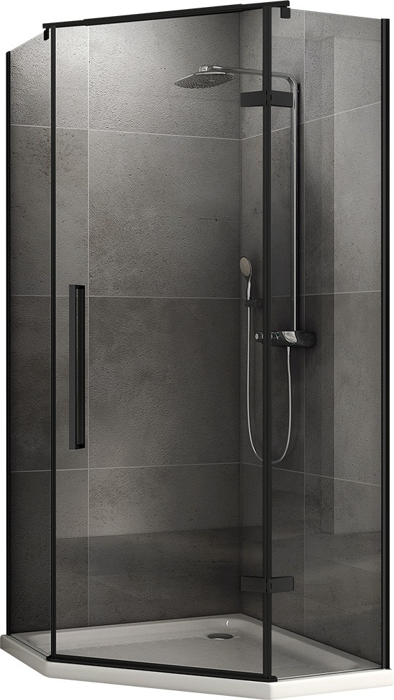 Душевой уголок Abber Ewiges Wasser AG05100B прозрачный с черным профилем — многоугольный душевой уголок с распашной дверью. Прозрачное закаленное стекло имеет толщину 6 мм, что обеспечивает прочность и безопасность уголка. Удлинненые тонкие металлические ручки смотрятся добротно и элегантно. Латунные петли прочны и долговечны. Кронштейн из латуни, который устанавливается над дверью, придает душевому ограждению необходимую жесткость. Черный профиль подчеркнет современную стилистику вашего интерьера.