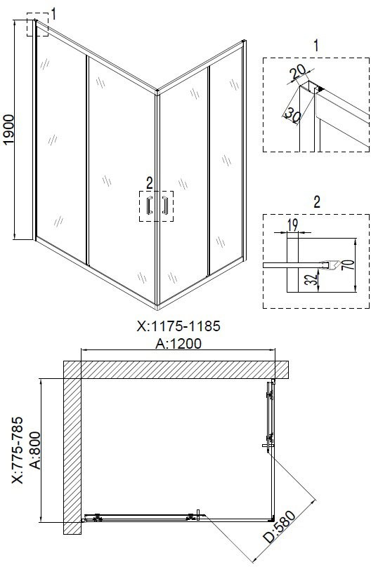 Тип кабины - Душевой уголок для пристенного монтажа в форме квадрата