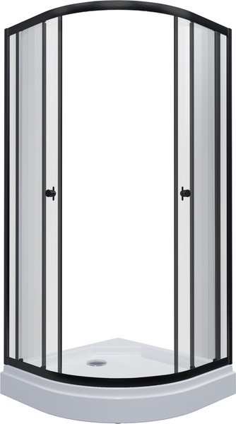 Модель устанавливается к двум стенам и комплектуется низким поддоном высотой 17 см из акрила закругленной формы. Белый цвет поддона и прозрачное бесцветное закаленное стекло толщиной 4 мм визуально расширяют пространство. Каркас и раздвижная система из двух створок выполнены из алюминиевого профиля черного цвета, что подчеркивает лаконичный дизайн и способствует долговечности. Слив круглой формы диаметром 9 см расположен в углу поддона для эффективного водоотведения. В комплектацию входят сифон без гофры и экран.
