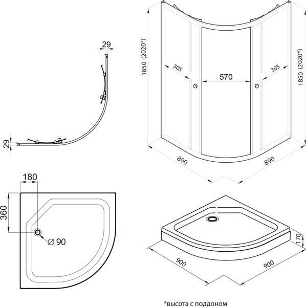 Габариты конструкции составляют 90×90×202 см и ширина входа 57 см обеспечивают комфортное использование. Применение душевого уголка создает функциональную зону, поддерживающую чистоту и порядок в ванной комнате.