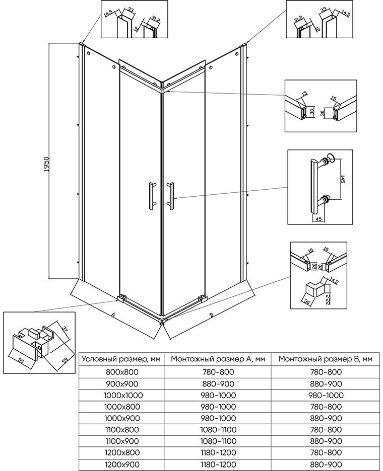 Тип кабины - Квадратный двухдверный душевой уголок для пристенного монтажа