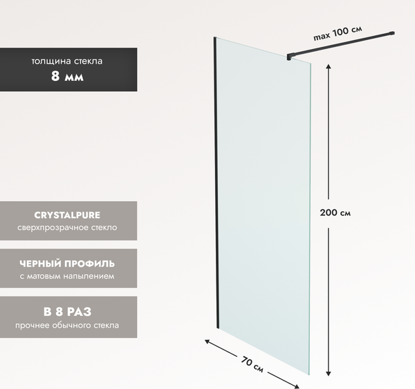 Душевая стенка Benetto BEN-602 BLC 70х200. Дополнительные элементы в комплекте: кронштейн, водоотталкивающее покрытие Easy Clean