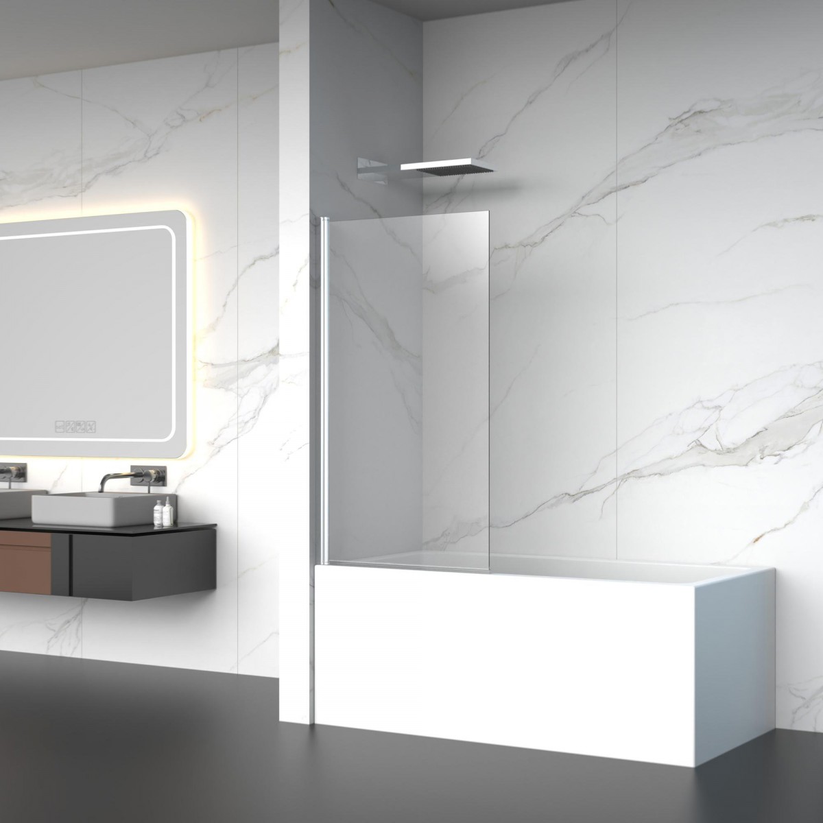 Шторка изготовлена из прочного закаленного стекла толщиной 6 мм, что гарантирует надежность и безопасность в использовании. Хромированный алюминиевый профиль с толщиной 1,2 мм придает изделию дополнительную прочность и устойчивость.