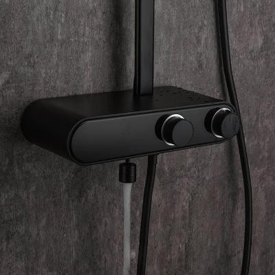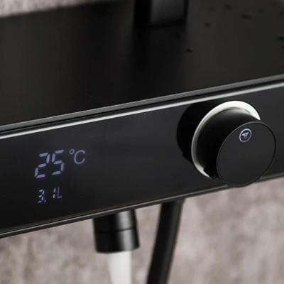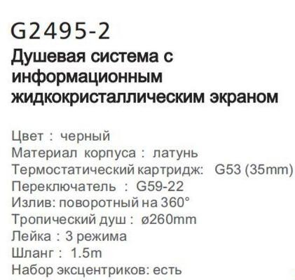 Душевая стойка Gappo G2495-2 с термостатом и информационным жидкокристаллическим экраном - выполнена из латуни, состоит из верхнего тропического душа, термостатического смесителя с полочкой, ручной лейки с держателем и душевым шлангом (150 см). Термостатический смеситель помогает поддерживать постоянную температуру воды, защищая этим от ее резких перепадов. Душевая стойка легко очищается от известкового налета, а латунный корпус прослужит долгое время. Цвет - черный.
