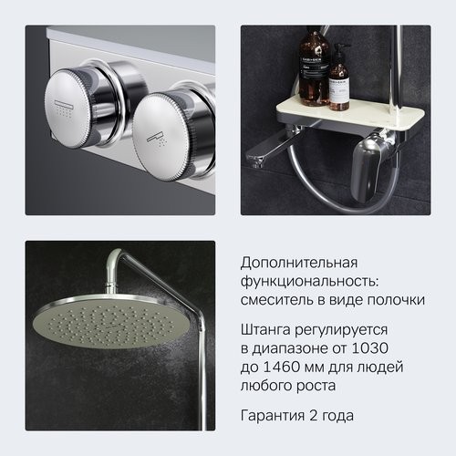 - Легкость и простота установки душевой системы. Регулируемая штанга душа по высоте от 1030 до 1460 мм позволит установить верхний душ индивидуально под свой рост.