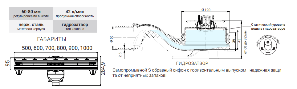 - Обеспечивает объемный, интенсивный сбор воды, вода стекает по краю напольной плитки в желоб водоотводящего канала;