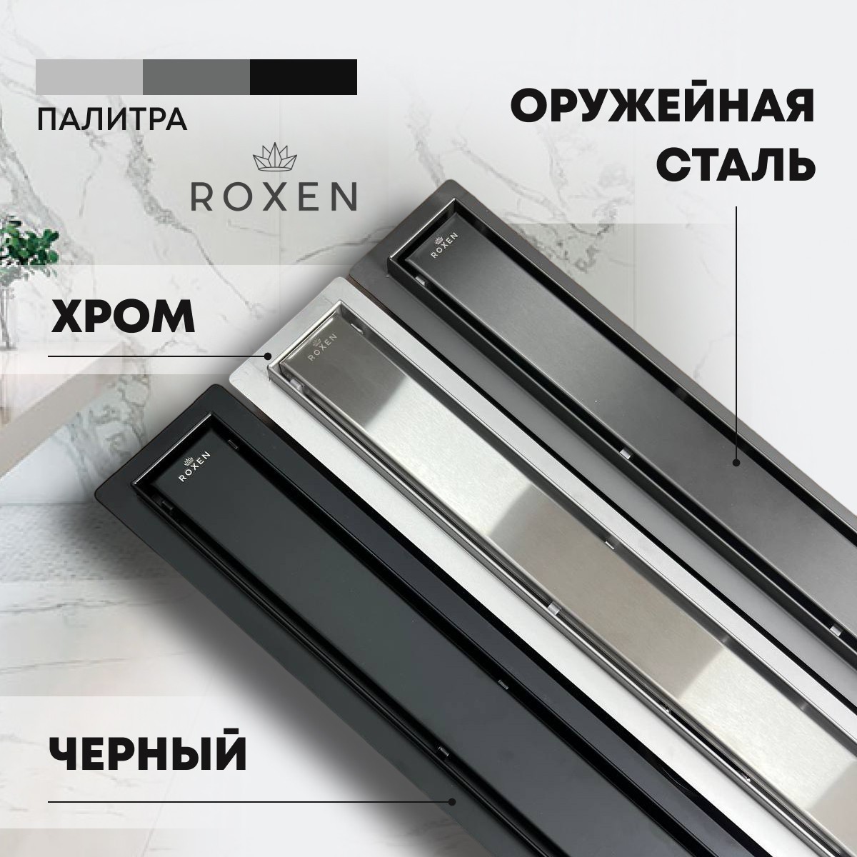 Душевой лоток Roxen Supra Black двусторонний под плитку - это практичное, стильное, современное решение для организации душевой зоны. Лоток выполнен в насыщенном черном матовом цвете, покрыт дополнительным устойчивым к химическим и механическим воздействиям покрытием, которое надежно защищает изделие от коррозии и царапин. Корпус и решетка душевого лотка изготовлены из нержавеющей стали, сифон - пластиковый, обладает высоким уровнем прочности. Оборачиваемая декоративная решетка позволяет легко изменить дизайн душевой зоны. Одна сторона решетки предназначена под укладку плитки и делает сливное устройство практически незаметным, а вторая - из нержавеющей стали с черным покрытием с повышенной устойчивостью к коррозии и царапинам.