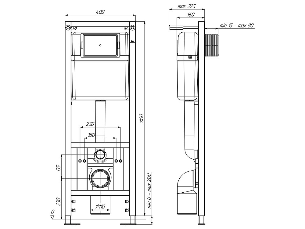 - Размеры инсталляции (В х Ш х Г) мм. - 1100–1300 (регулируемая) х 400 х 160-225 (регулируемая).