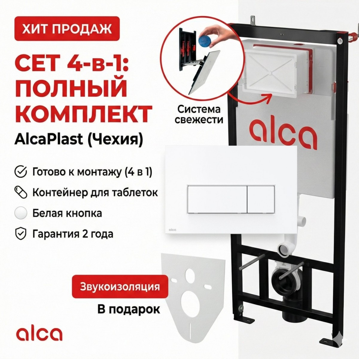 Инсталляция AlcaPlast AM101/1120: металлическая рама обработана черной порошковой краской, конструкция рамы предполагает крепление к достаточно жесткому гипсокартоному профилю или перед несущей стеной, полистирольная изоляция бачка снижает шум и препятствует образованию конденсата.