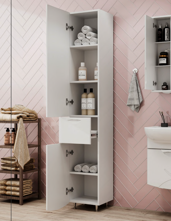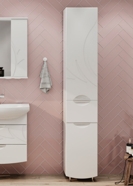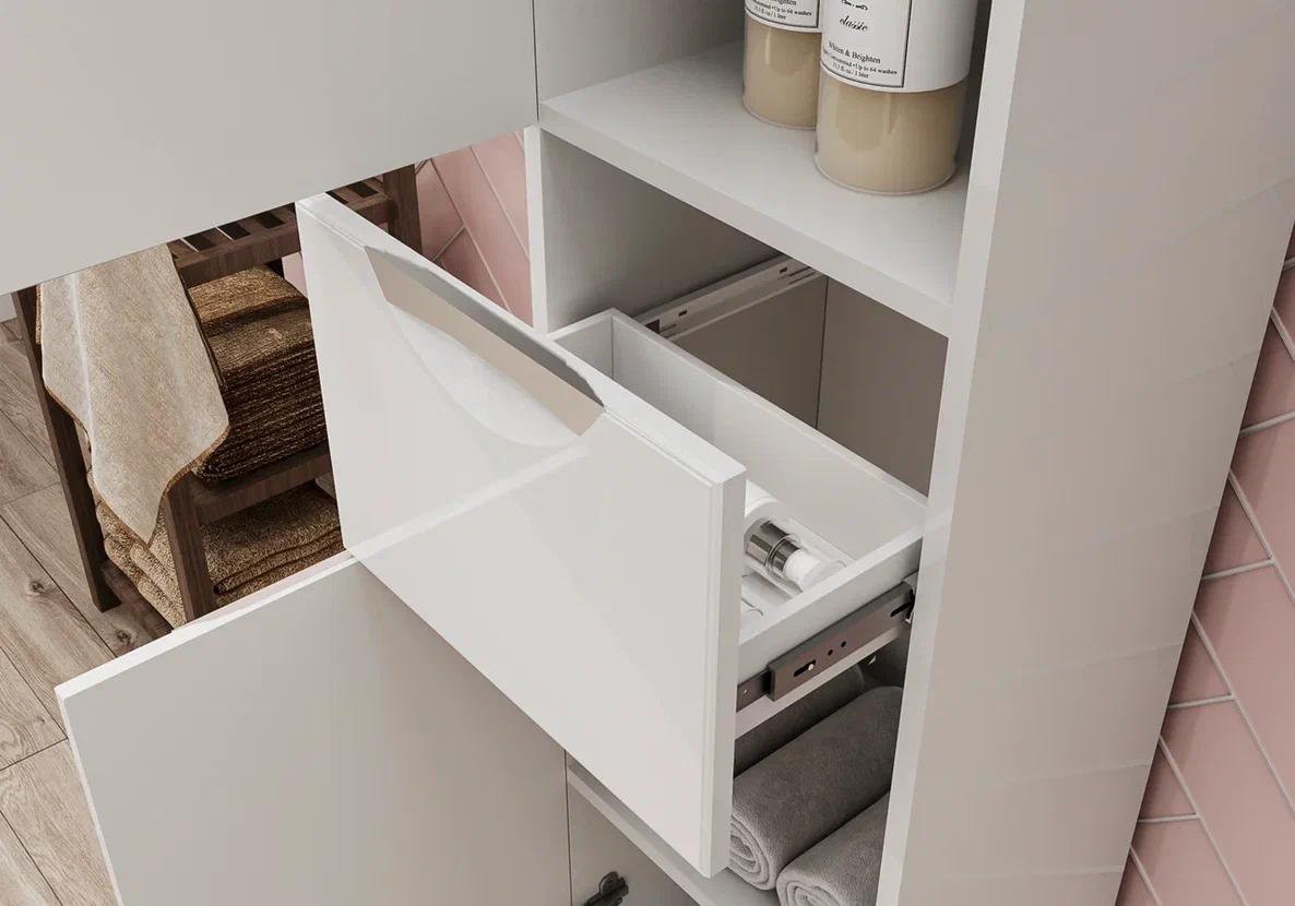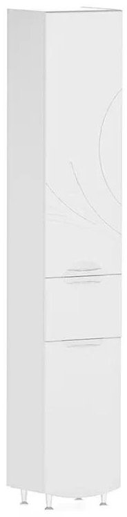 Напольный пенал с двумя стеклянными полками в верхней секции, выдвижным ящиком и одной полкой из ЛДСП в нижней секции. Петли оснащены доводчиками. Дверцы пенала изготовлены из МДФ и облицованы глянцевой пленкой ПВХ. Лицевая фурнитура хром. Пенал устанавливается на четыре регулируемые опоры и фиксируется к стене при помощи креплений.