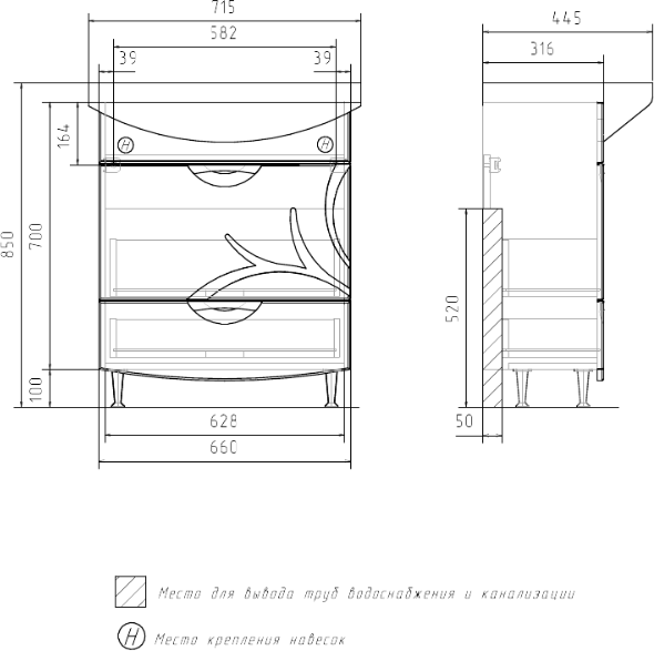 Напольная тумба с двумя выдвижными ящиками с системой плавного закрывания. Фасады тумбы изготовлены из МДФ и облицованы глянцевой пленкой ПВХ. Лицевая фурнитура хром. Тумба устанавливается на четыре регулируемые опоры и фиксируется к стене при помощи креплений.