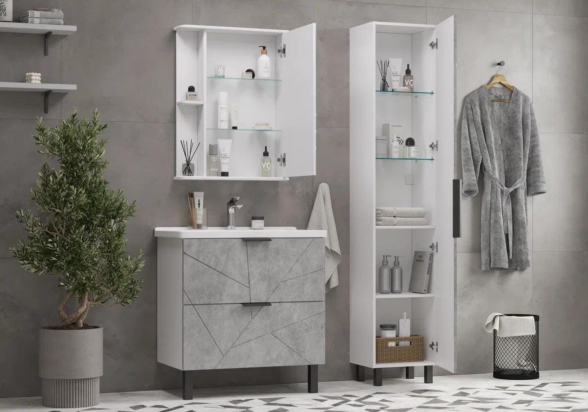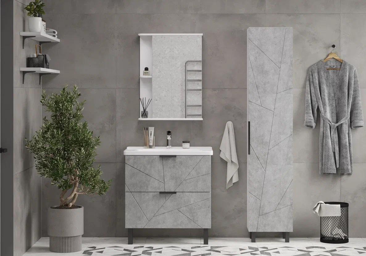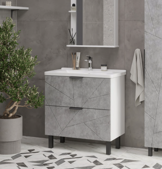 Напольная тумба с двумя выдвижными ящиками с системой плавного закрывания. Фасады тумбы изготовлены из МДФ и облицованы матовой пленкой ПВХ в цвете бетон. Лицевая фурнитура черный матовый. Тумба устанавливается на две регулируемые опоры и фиксируется при помощи креплений к стене.