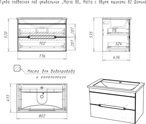 Тумба для ванной под умывальник Домино Maria 80 Malta подвесной с двумя ящиками В2. Совместимые модели - умывальник (Миранда 80, Фостер 80)
