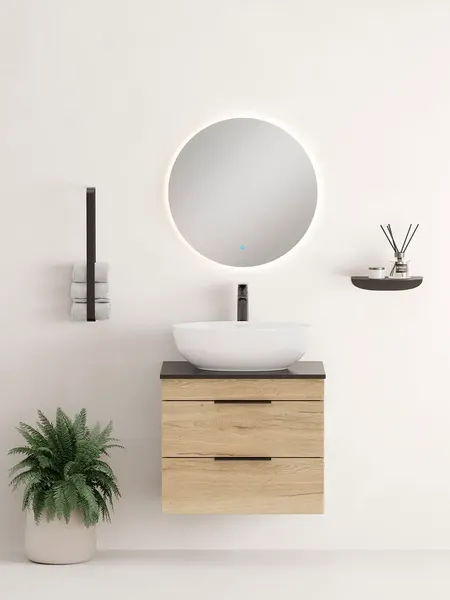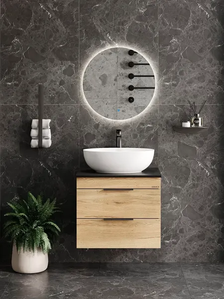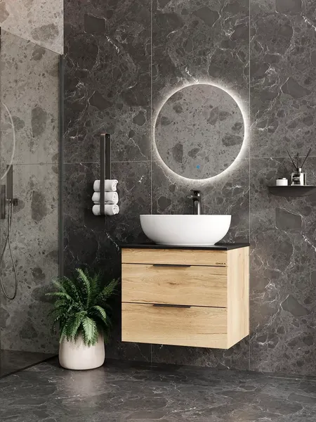 Подвесная тумба для ванной комнаты Легран 60 под столешницу — это сочетание насыщенного древесного декора и благородства металла: роскошная текстура и натуральный цвет дуба дают теплоту, а матовые металлические ручки добавляют урбанизма и солидности. Два ящика тумбы плавно открываются и закрываются благодаря направляющим полного выдвижения с доводчиками. Тумба выполнена из ЛДСП, устойчивой к механическим воздействиям, перепадам температур и высокой влажности, при этом она надежно крепится к стене и не занимает место на полу, не создавая при этом сложностей в уборке помещения. Ручки и подвесы для крепления тумбы - в комплекте.