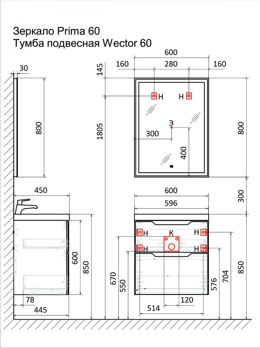 Тумба под умывальник Raval Wector 60x45 антрацит - ширина: 60 см, глубина: 45 см, высота: 60 см, монтаж: Подвесной
