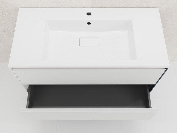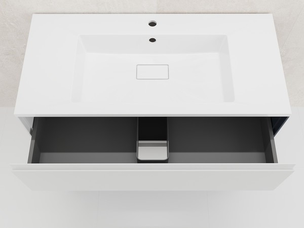 Выдвижные ящики с системой плавного закрывания снабжен эргономичным ограничителем под сифон.