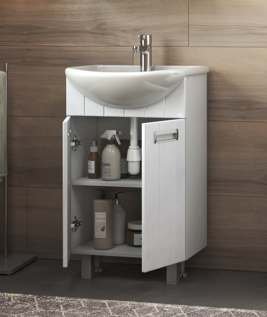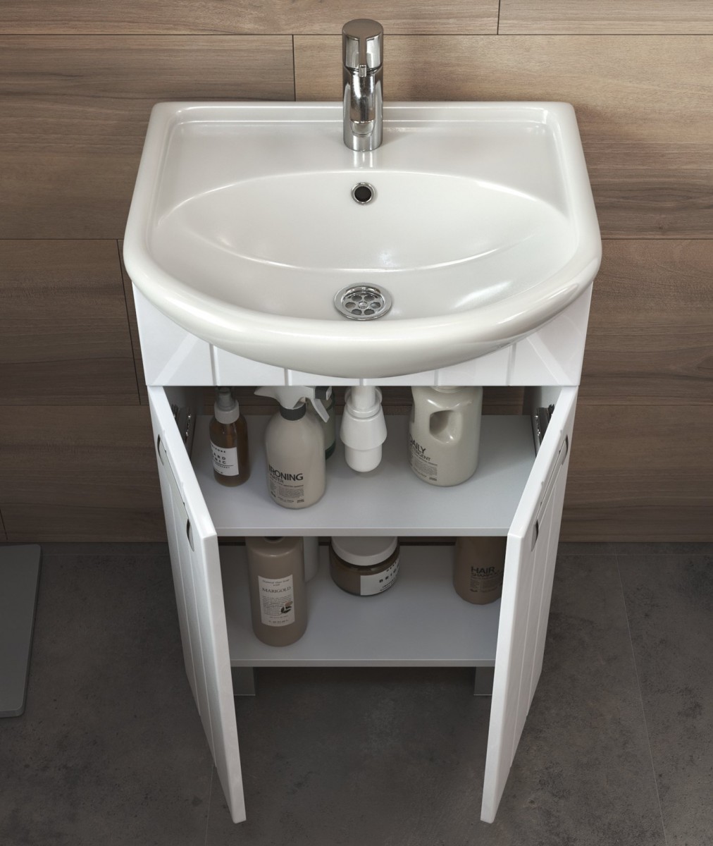 Компактная тумба с двумя распашными дверцами (под умывальник Уют 500). Оснащена петлями с механизмом плавного закрывания.