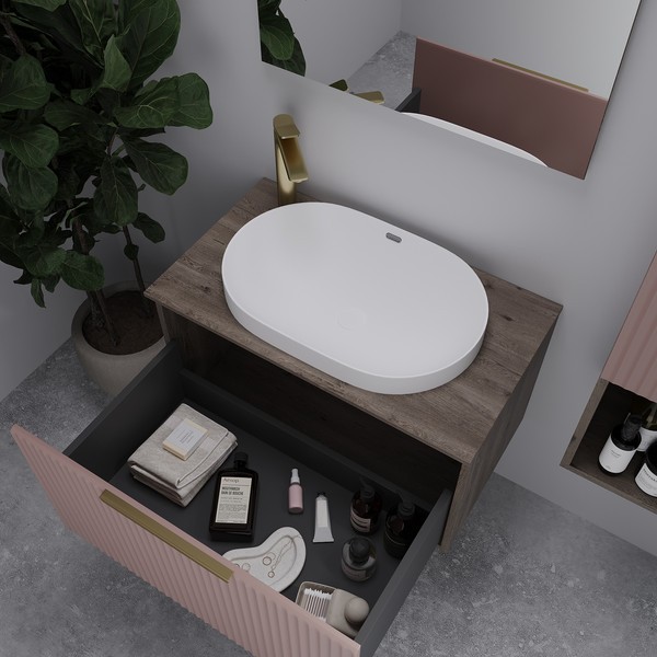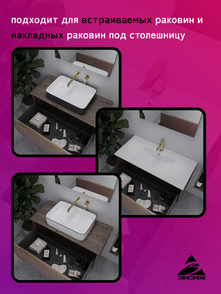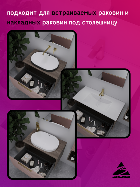 - Вместительные ящики с системой Quadro — плавное и бесшумное выдвижение, удобное хранение банных принадлежностей и косметики.