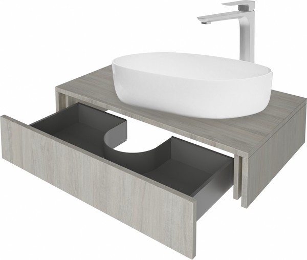 Универсальная столешница выполнена из ЛДСП, имеет два выреза, что позволяет легко установить на неё раковину и смеситель.