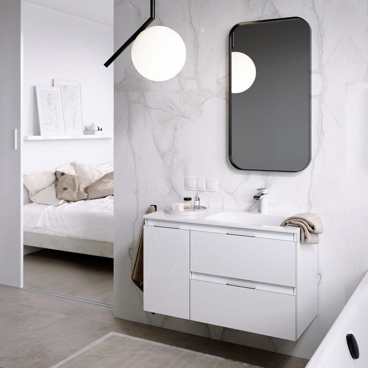 Подвесная тумба с двумя ящиками и одной дверью в белом цвете с умывальником из литьевого мрамора (чаша справа).