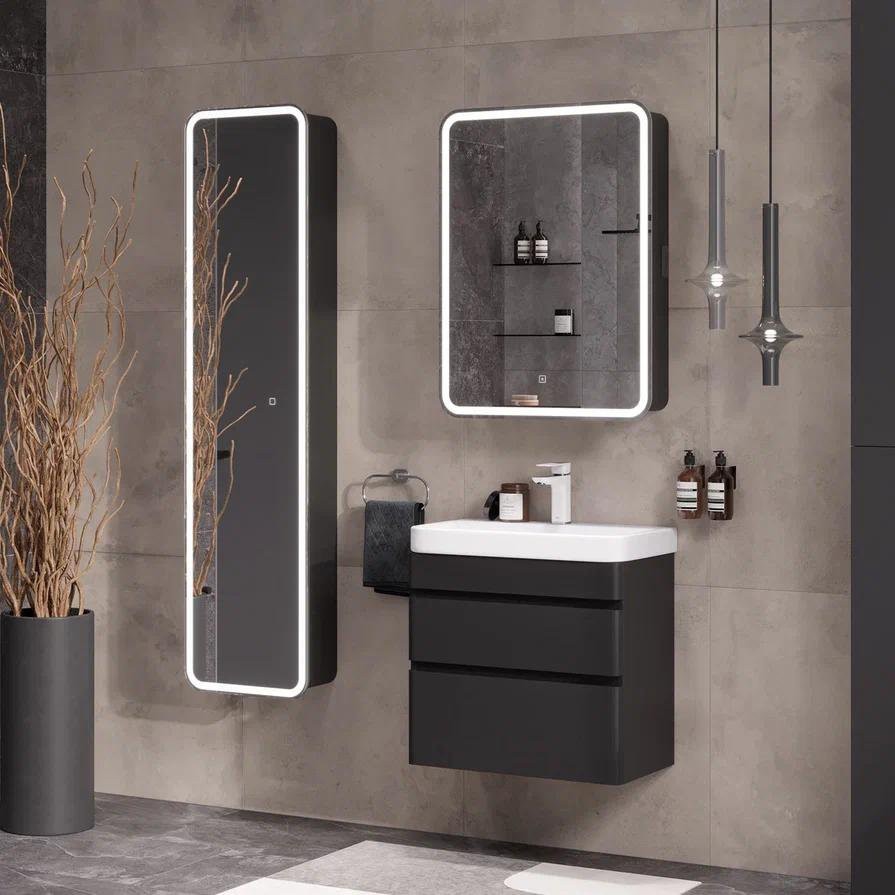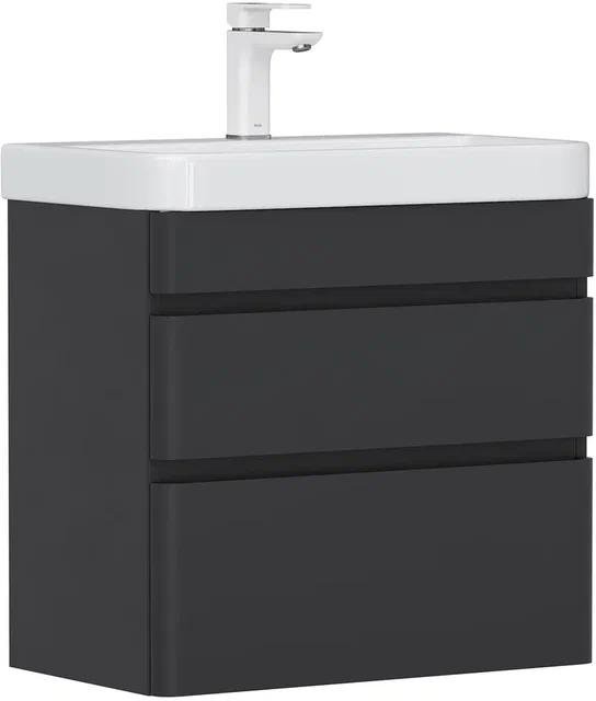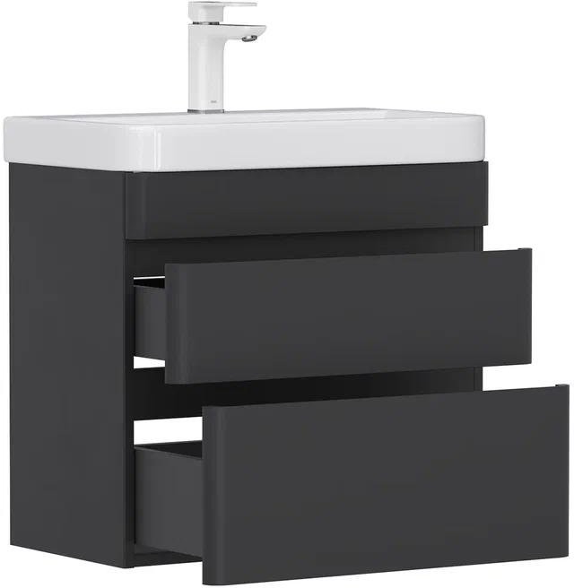 Подвесные тумбы с двумя выдвижными ящиками в черном цвете под раковину из керамики. Направляющие оснащены доводчиками.