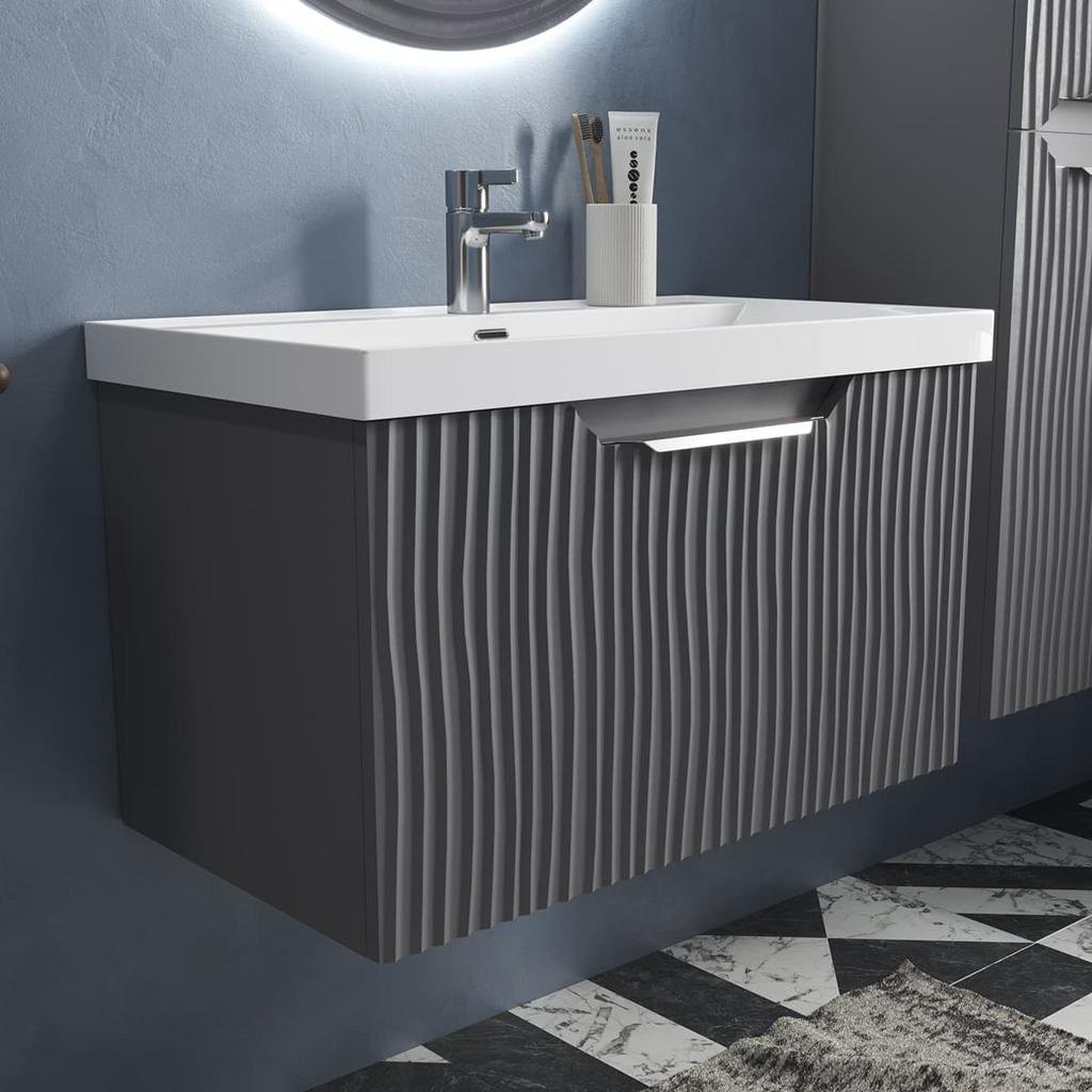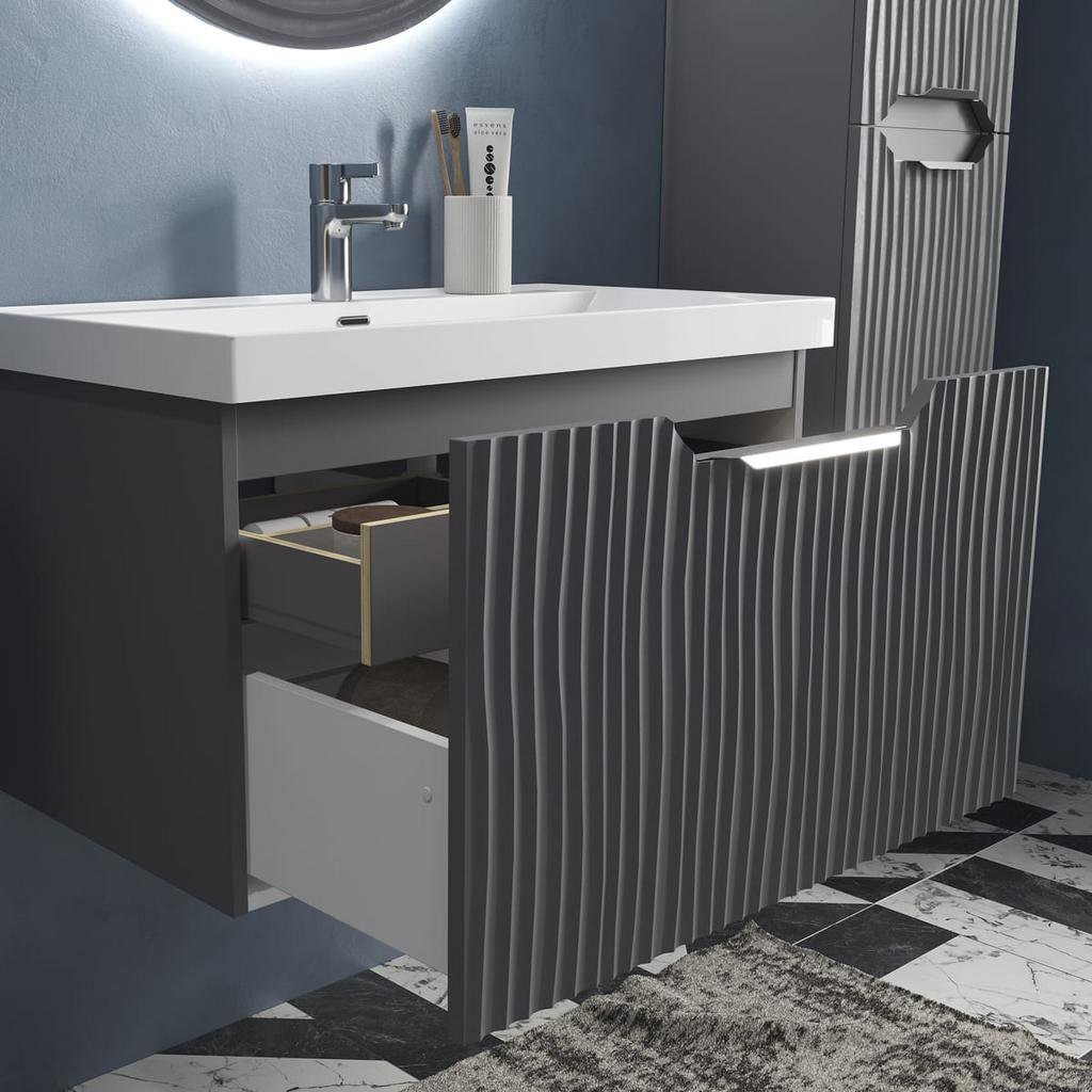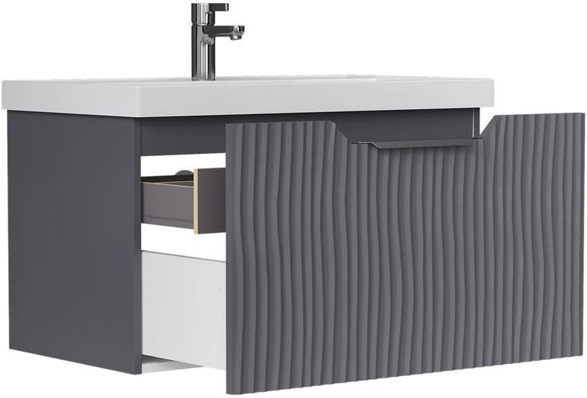 Mirage - это оригинальная коллекция, выполненная в элегантном цвете графит. Матовая поверхность мебели с эффектом Soft Touch подчеркивает гармоничный внешний вид и создает приятные тактильные ощущения при использовании. Фасады мебели стилизованы декоративной фрезеровкой, вдохновлённой рельефом песчаных дюн, которая создаёт неповторимый образ коллекции, превращая её в центр притяжения внимания в любом интерьере ванной комнаты. Для оптимизации хранения в тумбах предусмотрены встраиваемые органайзеры, которые оснащены специальным покрытием, предотвращающим скольжение предметов.