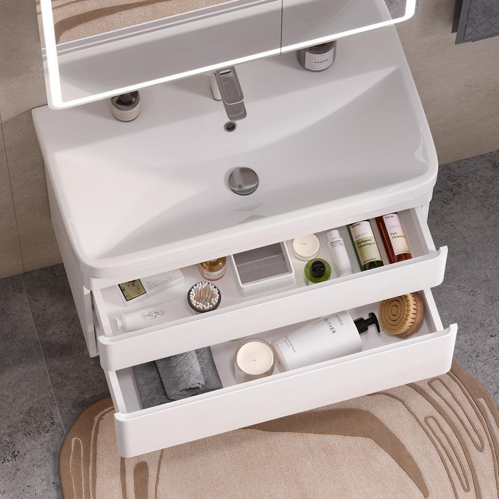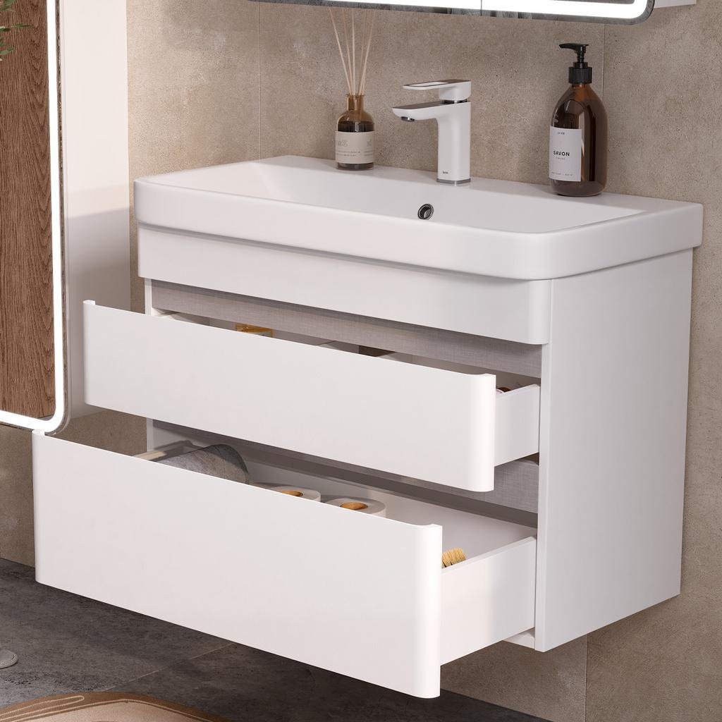 Подвесные тумбы с двумя выдвижными ящиками в белом цвете со вставками софт под раковину из керамики. Направляющие оснащены доводчиками.