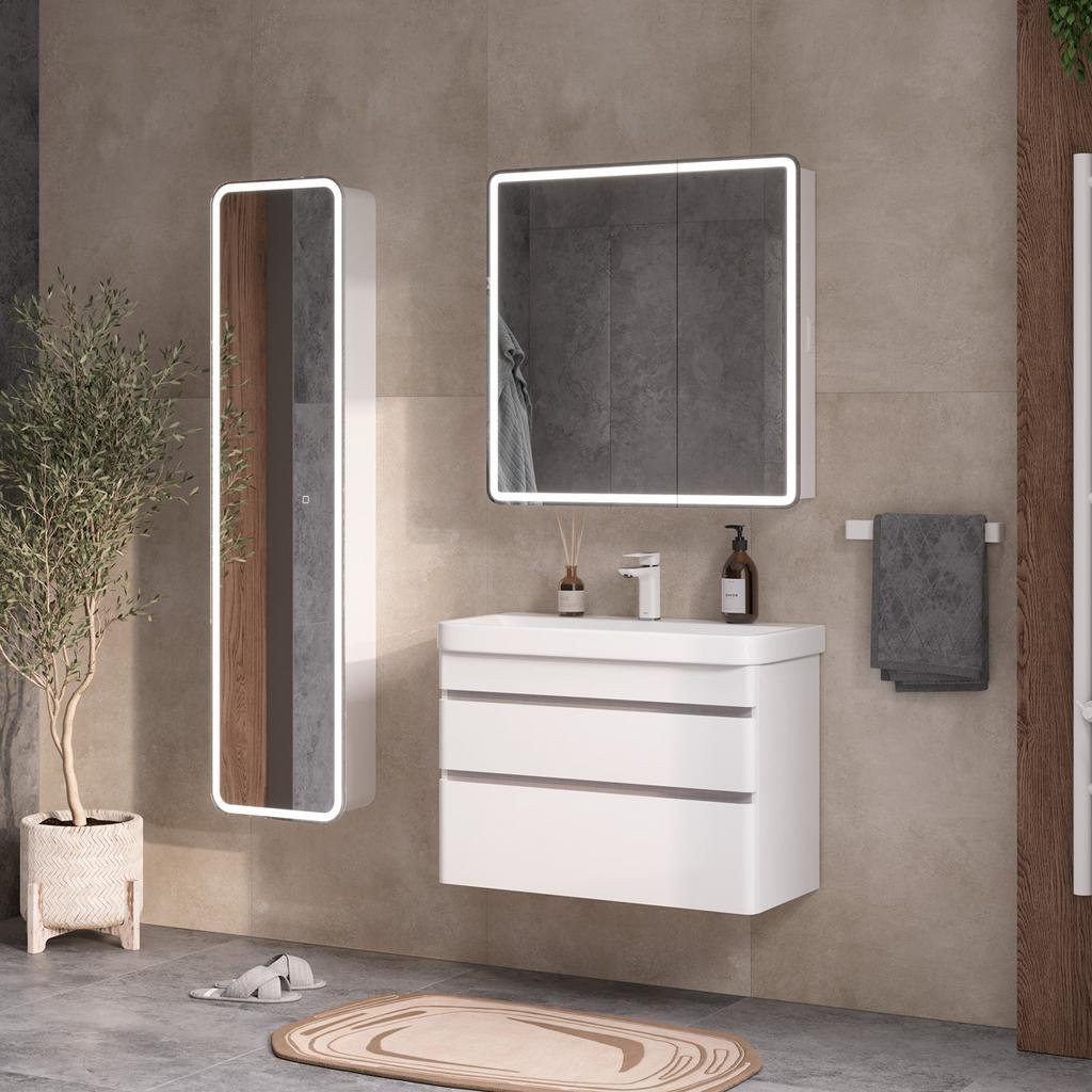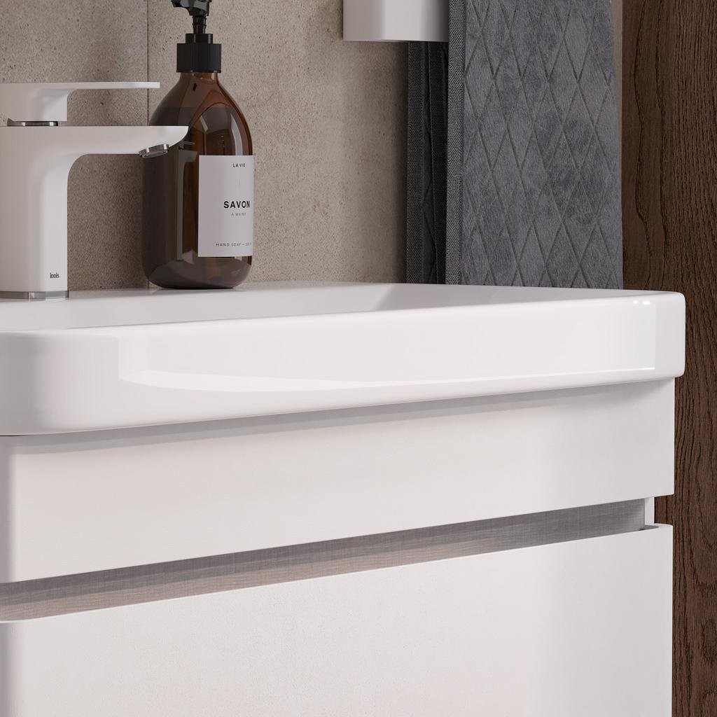 SOLDI — это современная коллекция мебели с акцентом на лаконичный дизайн. Основной элемент — подвесные тумбы белого цвета с фасадами, покрытыми матовой белой пленкой с эффектом «Soft Touch». Вставки с текстурным декором «Софт» создают уникальный визуальный эффект. Фасады имеют радиусное закругление, которое придает коллекции плавные и элегантные линии. Характерной особенностью коллекции SOLDI является отсутствие лицевой фурнитуры на тумбах. Вместо этого ящики открываются посредством интегрированных ручек, что делает более элегантной и удобной в использовании. Коллекция хорошо сочетается с различными интерьерными стилями и придает пространству легкость и воздушность.