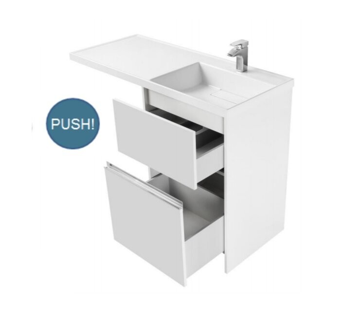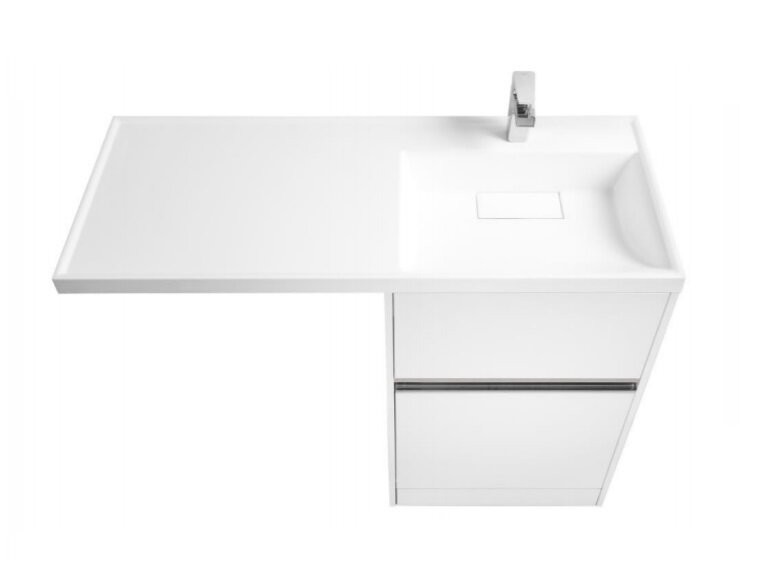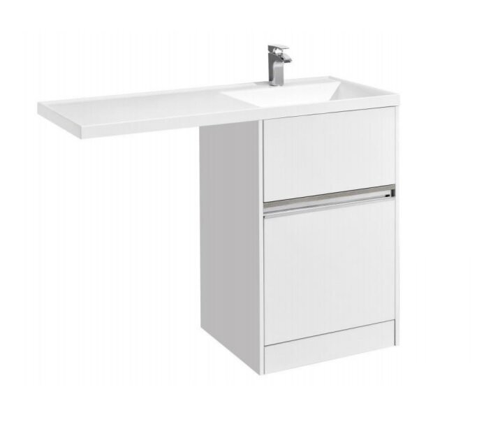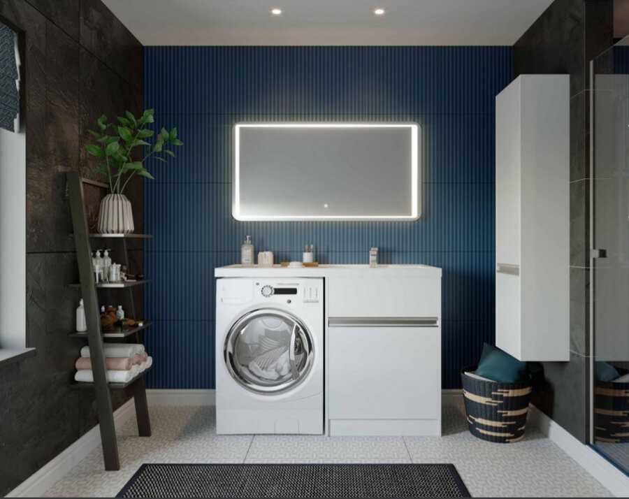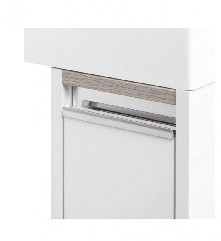 Тумба Лондри под стиральную машину выполнена из влагостойкой ламинированной плиты и окрашена в белоснежный цвет с высокой степенью глянца полиэфирной краской ультрафиолетового отверждения. Данный способ окрашивания обеспечивает изделию привлекательный внешний вид, а также износостойкость и долговечность.Верхний ящик открывается с помощью системы push-to-open, а нижний - за изящную удобную профильную хромированную ручку. Над ручкой установлена вставка из влагостойкой ламинированной плиты благородного цвета дуб наварра. Ящики выдерживают нагрузку до 25 кг. Тумба установлена на регулируемые опоры, которые находятся за цоколем. Широкое крыло раковины обеспечивает ванную комнату дополнительным функциональным пространством.