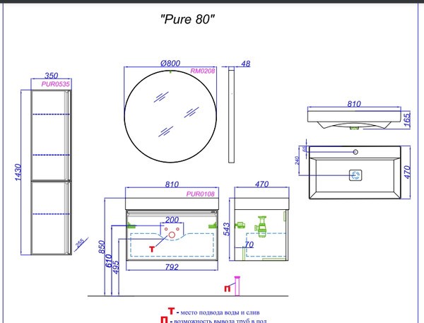 Тумба для ванной с умывальником Aqwella Pure / PUR0108WM.