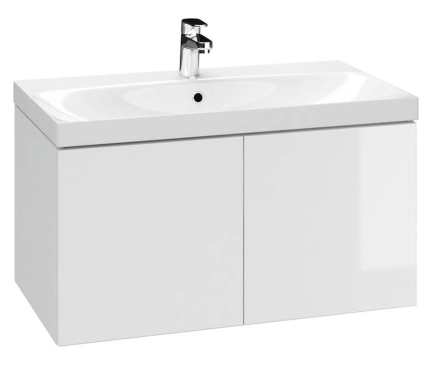 Белые глянцевые фасады, четкие геометрические формы тумбы помогут создать минималистичный и строгий интерьер ванной комнаты.