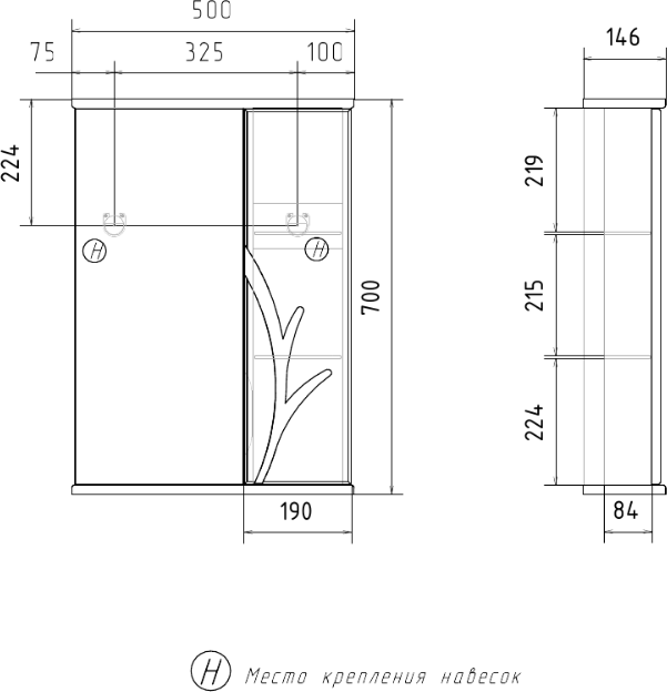 Зеркало-шкаф с двумя стеклянными полками за распашной дверцей. Петли оснащены доводчиками. Фасад зеркального шкафа изготовлена из МДФ и облицована глянцевой пленкой ПВХ. Зеркало-шкаф оснащено встроенной светодиодной подсветкой, электрической розеткой и выключателем. Шкафчик открывается при помощи интегрированной ручки.