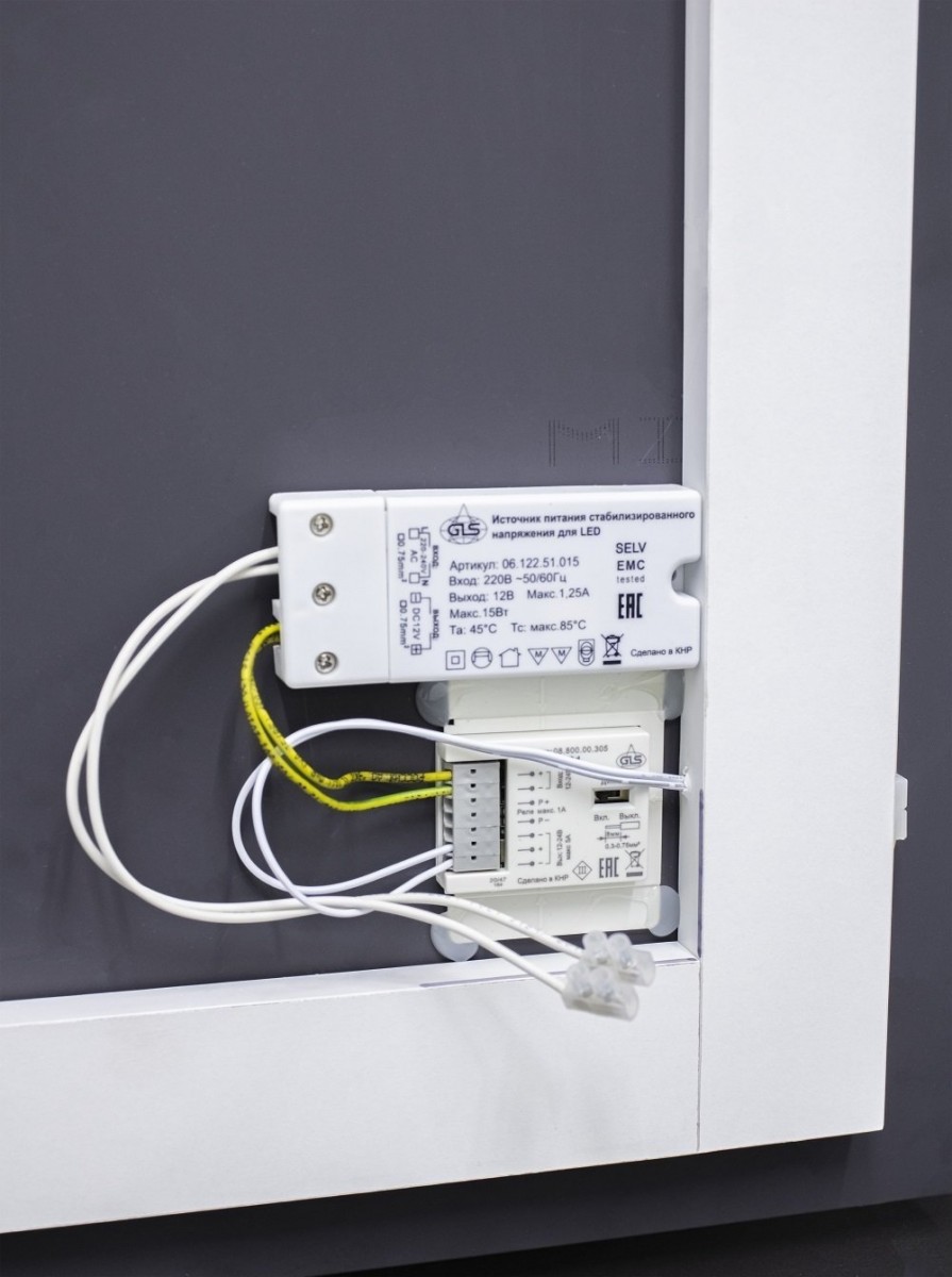 - В комплектацию зеркала входит источник питания, стабилизирующий напряжение (трансформатор), что позволяет подключать изделие к сети 220В.