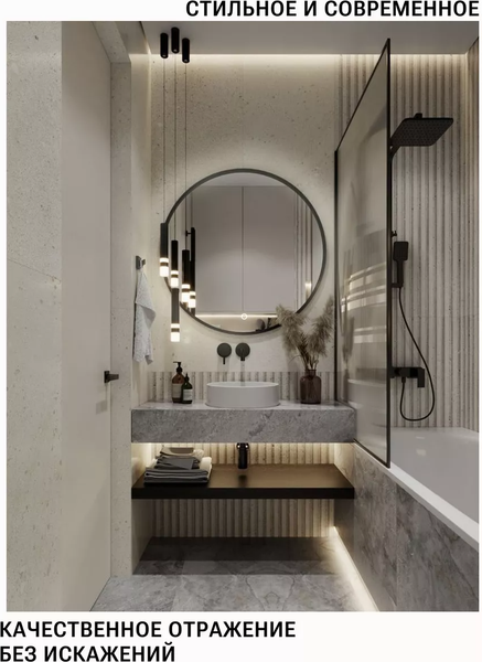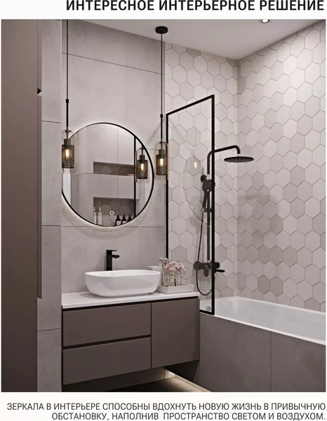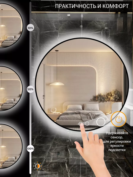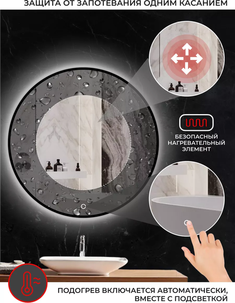 Зеркало большое круглое в раме окантовке – находка для желающих создать уникальный стиль комнаты. Цвет подсветки: дневной белый (4000К) - приятен для глаз. Сенсорное включение с плавным пуском, срабатывает при лёгком касании. Матовая окантовка, шириной 10 мм, выполнена методом УФ-печати, для нанесения которой используется экологически чистые чернила (не содержат вредных примесей и химически активных веществ) устойчивые к влаге. Зеркало для прихожей, для спальни и гостиной парящее выполнено из влагостойкого полотна со шлифованной кромкой, что делает его безопасным и удобным в использовании, а также позволяет установить его в помещениях с повышенной влажностью: для ванной и душевой кабины и душа, для бани или сауны, в туалет и санузел. Обогрев позволяет за 5-7 минут нагреть изделие, убирая эффект запотевания. Нагревательный элемент 2 класса электрозащиты и защитой IP54. Поверхность окантовки - бархатиста с легким изящным блеском.