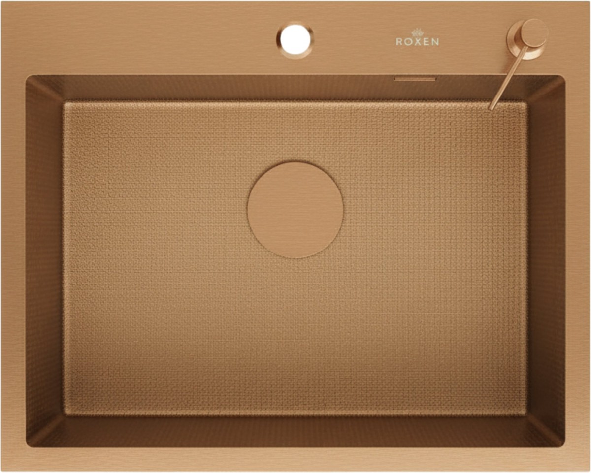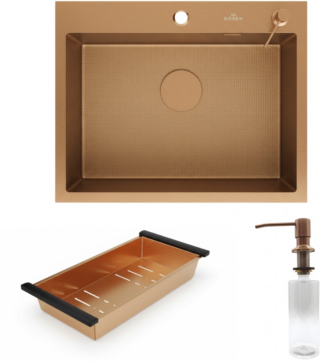 Кухонная мойка Roxen Snake 560220-60-BRS 60x48 брашированная бронза из нержавеющий стали врезная, прямоугольная. Сифон, дозатор и коландер в комплекте.