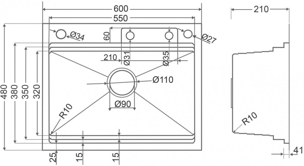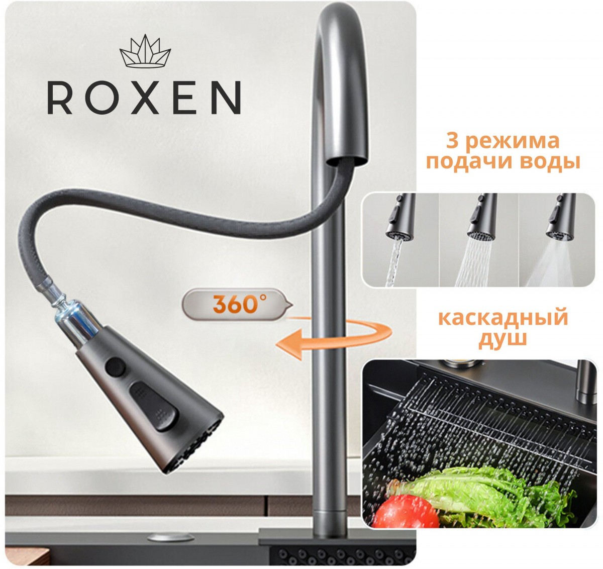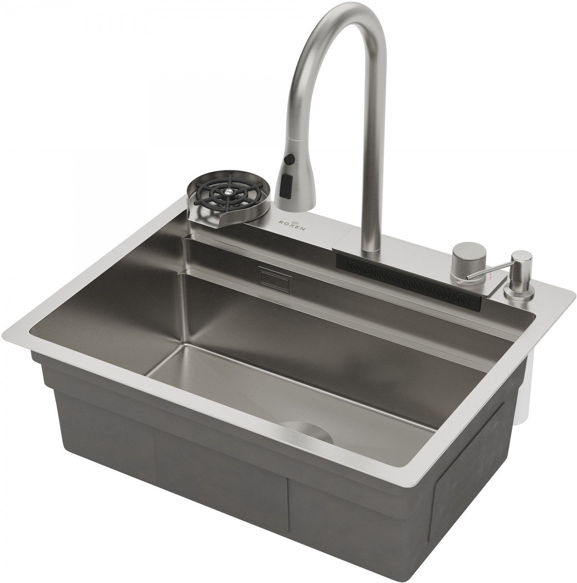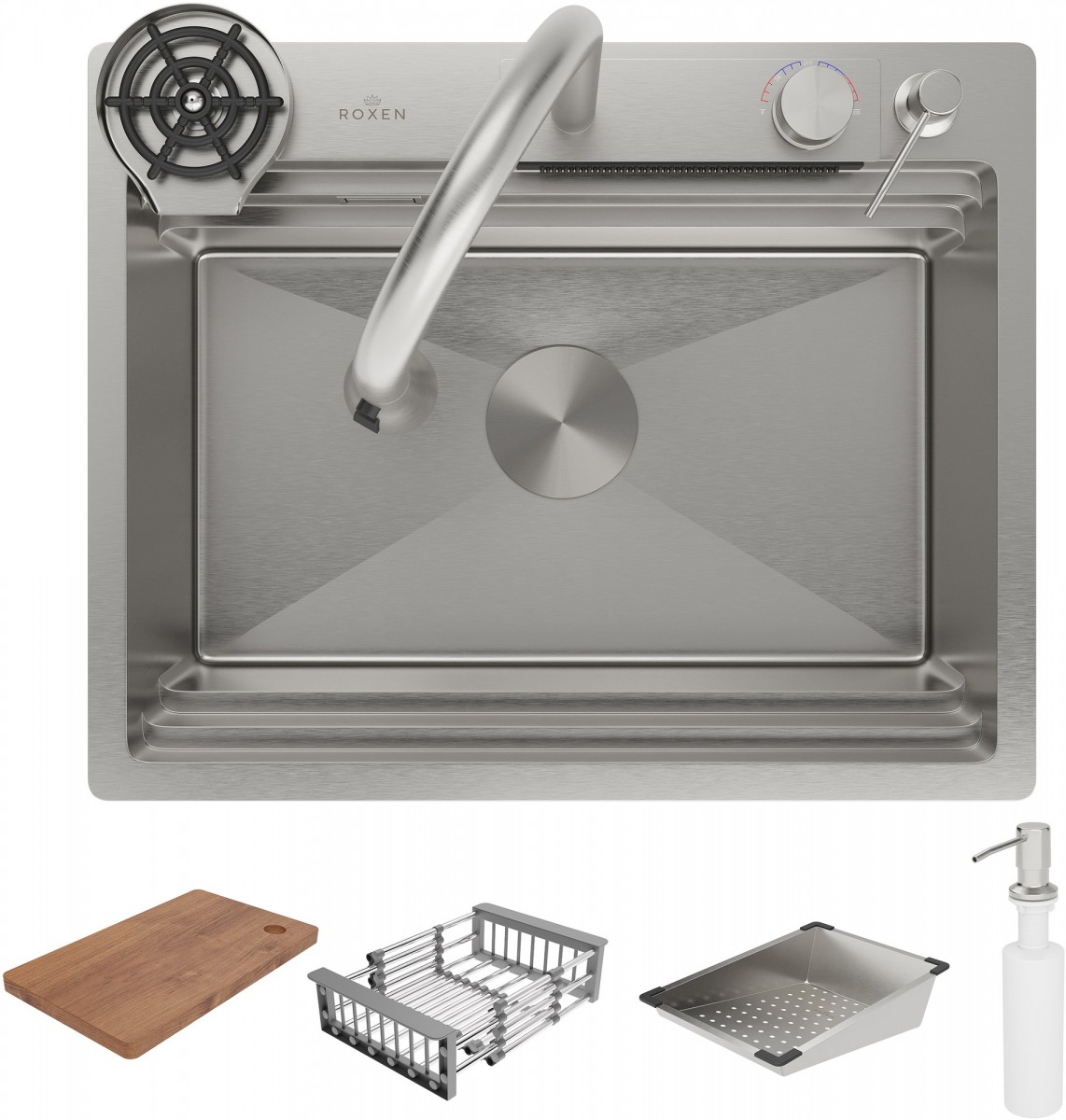 Кухонная мойка Roxen Stage Plus 560250-60 60x48 сатин из нержавеющий стали врезная, фактура: матовая. Сифон, дозатор и коландер в комплекте.