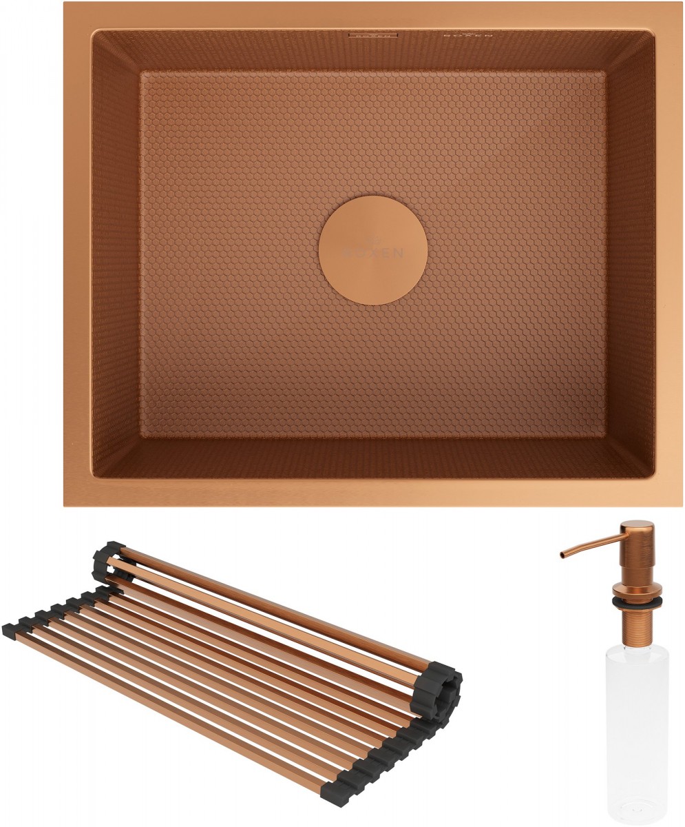 Кухонная мойка Roxen Uno 560210-54-BRS PVD (bronze brush текстурная) под столешницу с ролл-матом и дозатором (износостойкое покрытие) - современная модель премиального сегмента в цвете бронза (bronze brush текстурная) с глубокой прямоугольной чашей, сочетает в себе стильный современный дизайн и отличные эксплуатационные характеристики. Мойка устанавливатеся под столешницу, комплектуется необходимыми креплениями. Изготовлена из аустенитной низкоуглеродистой стали марки AISI 304, которая обладает устойчивостью к коррозии, окислению и перепаду температур. Толщина стали исключает деформацию и обеспечивает долгий срок эксплуатации. Уникальное покрытие Bruch Tech является защитным слоем, устойчивым к истиранию, появлению царапин и механических повреждений. Отличные шумопоглощающие характеристики мойки обеспечиваются шумоподавляющим составом Silent Protection и шумопоглощающими пластинами Soft Silence, которые располагаются по всей чаше мойки.