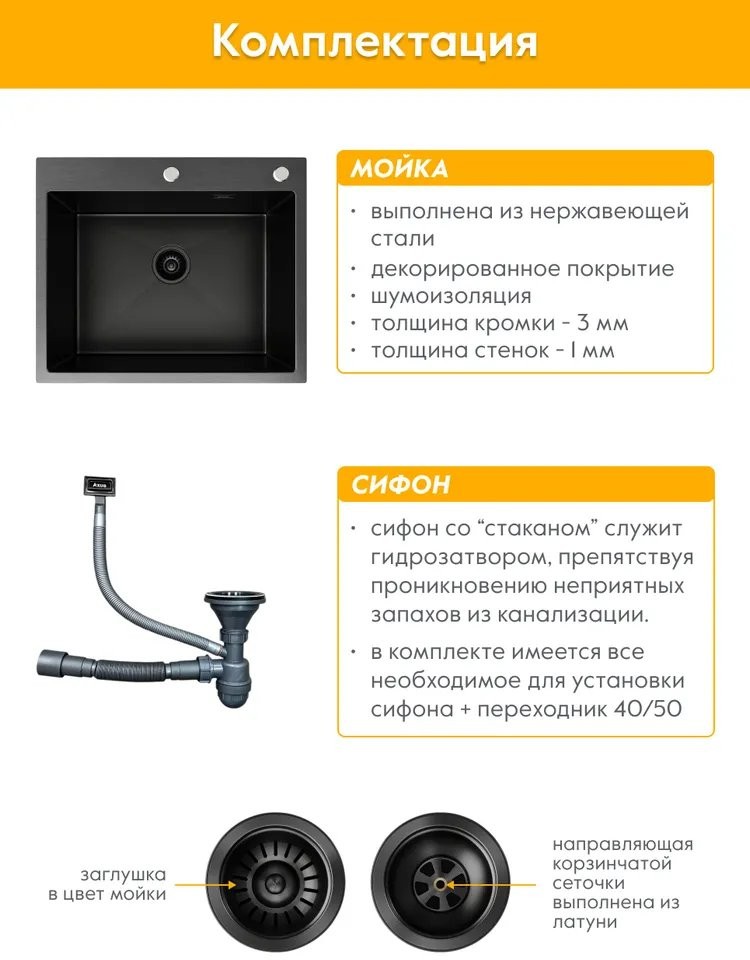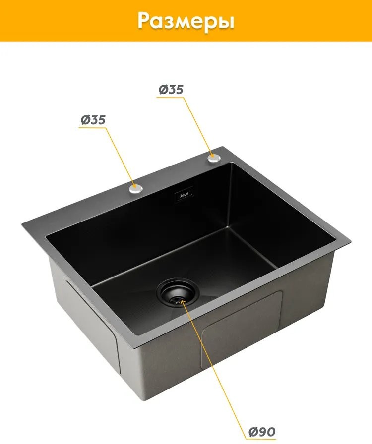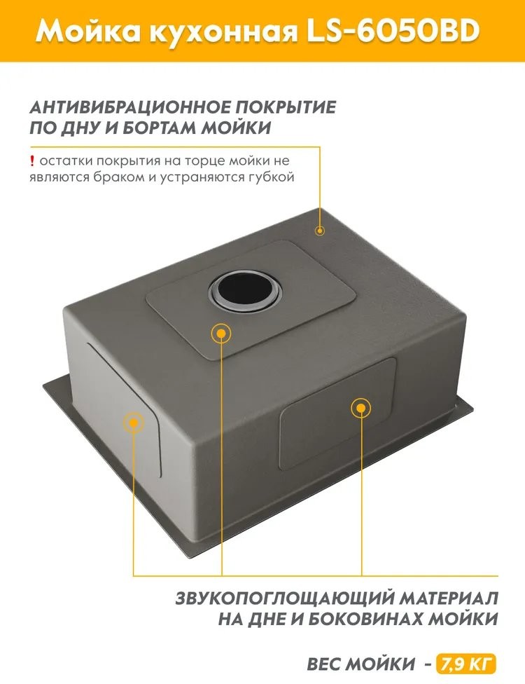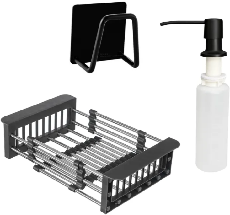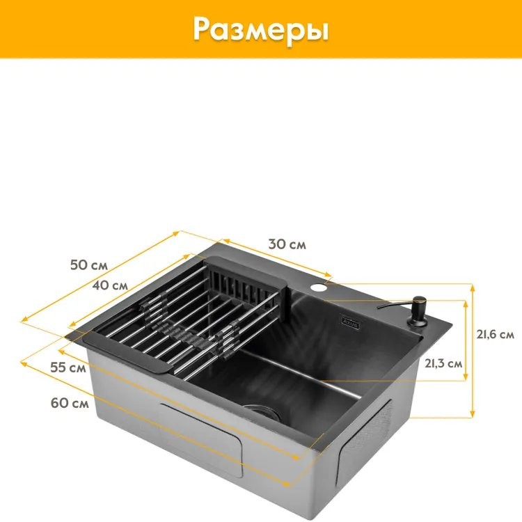 Мойка для кухни Axus LS-6050BD 60x50 с дозатором, графит, Ширина: 60 см, Длина: 50 см, Глубина чаши: 21.6 см, Цвет: Графит, Материал: Нержавеющая сталь
