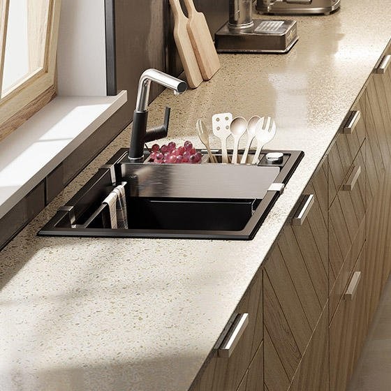 Гранитная 1-камерная магнитная кухонная мойка в элегантном черном цвете, идеально подходящем для минималистичных или скандинавских кухонь, представляет собой современную раковину с магнитными свойствами, невидимыми для пользователя на первый взгляд. Раковины из авторской коллекции Magnetic оснащены магнитами, благодаря которым на боковую часть камеры можно положить стальную решетку. Элегантная решетка отделяет отсек от боковой полки, создавая дополнительное пространство, которое увеличивает функциональность раковины и позволяет оборудовать ее специальными аксессуарами из коллекции – гигиеническими держателями для посуды. Встраиваемая в столешницу кухонная мойка имеет просторное отделение, характеризуется всеми преимуществами, типичными для этого чрезвычайно жесткого и стойкого к использованию материала, а эффектный черный цвет будет идеально сочетаться с черным кухонным смесителем и деревянными или каменными столешницами.