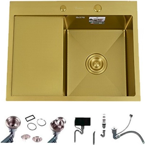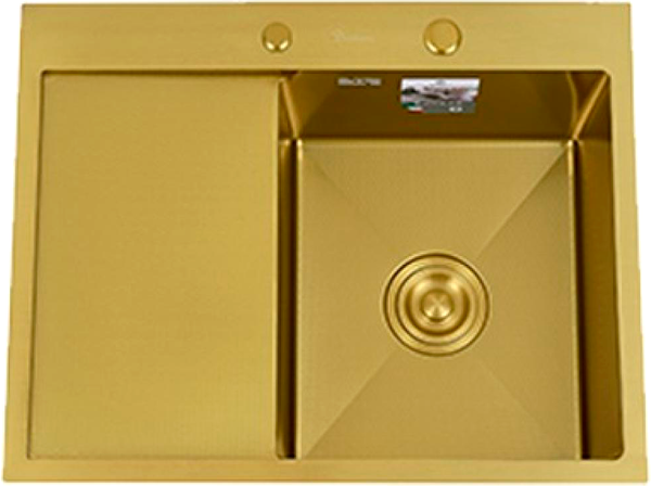 Многофункциональная кухонная мойка из нержавеющей стали c PVD покрытием. Расположение основной чаши с правой стороны.