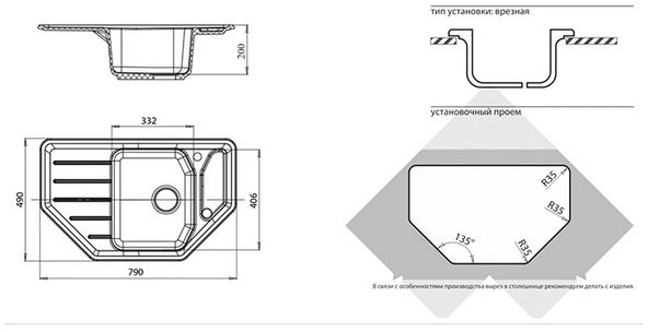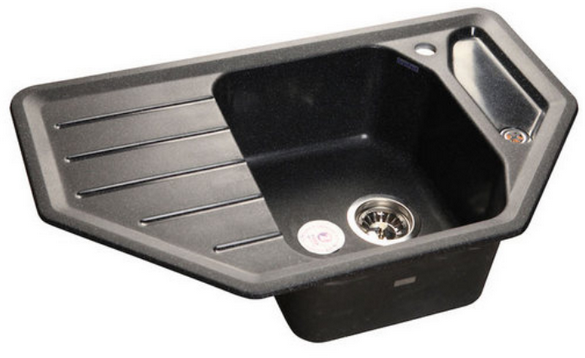 Мойка из искусственного камня, врезная, угловая. Практичная и функциональная модель, имеет удобное крыло и небольшое дополнительное крыло со сливным отверстием.