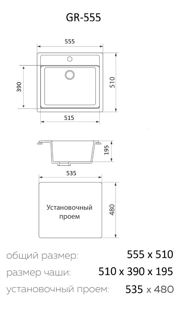 Мойка для кухни Granrus GR-555 (бежевый). Размер чаши: 39x51x19.5 см.
