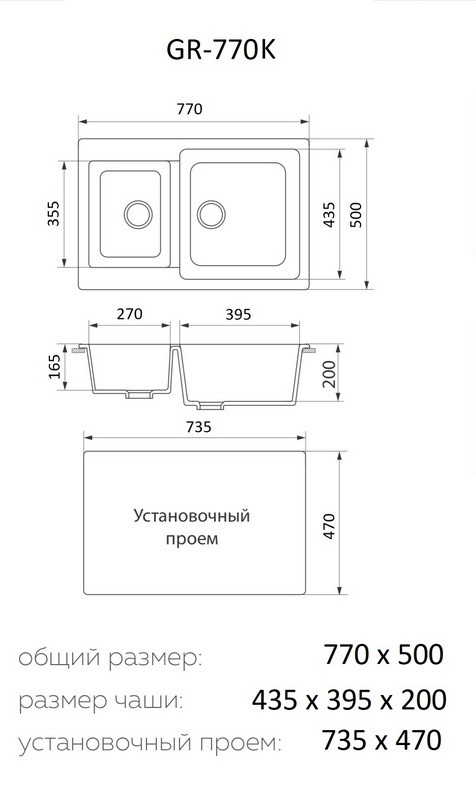 Мойка для кухни Granrus GR-770 K (черный). Размер чаши: 43.5x39.5x20 см.; 35.5x27x16.5 см.