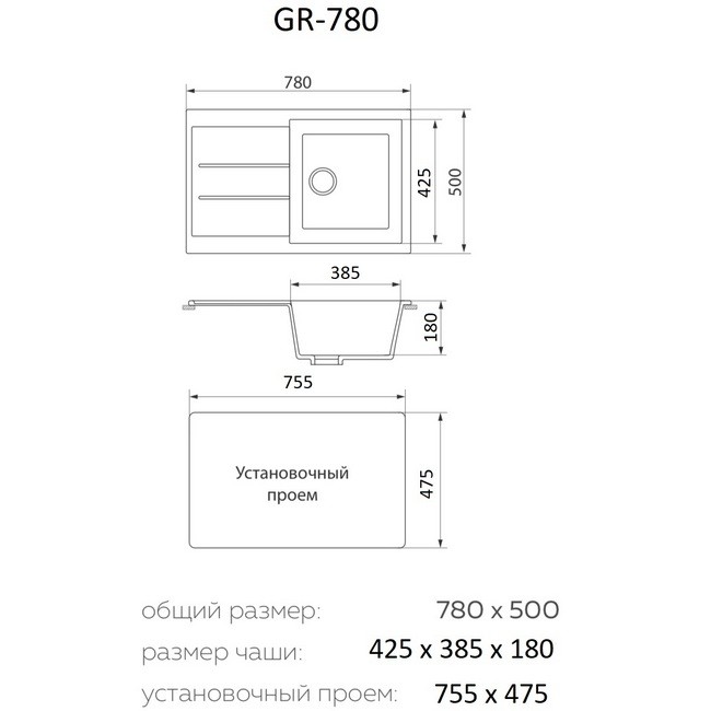 Мойка для кухни Granrus GR-780 (антрацит). Размер чаши: 42.5x38.5x18 см.
