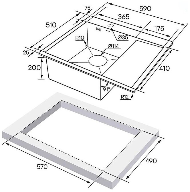 - Размер мойки 59 x 51 см
